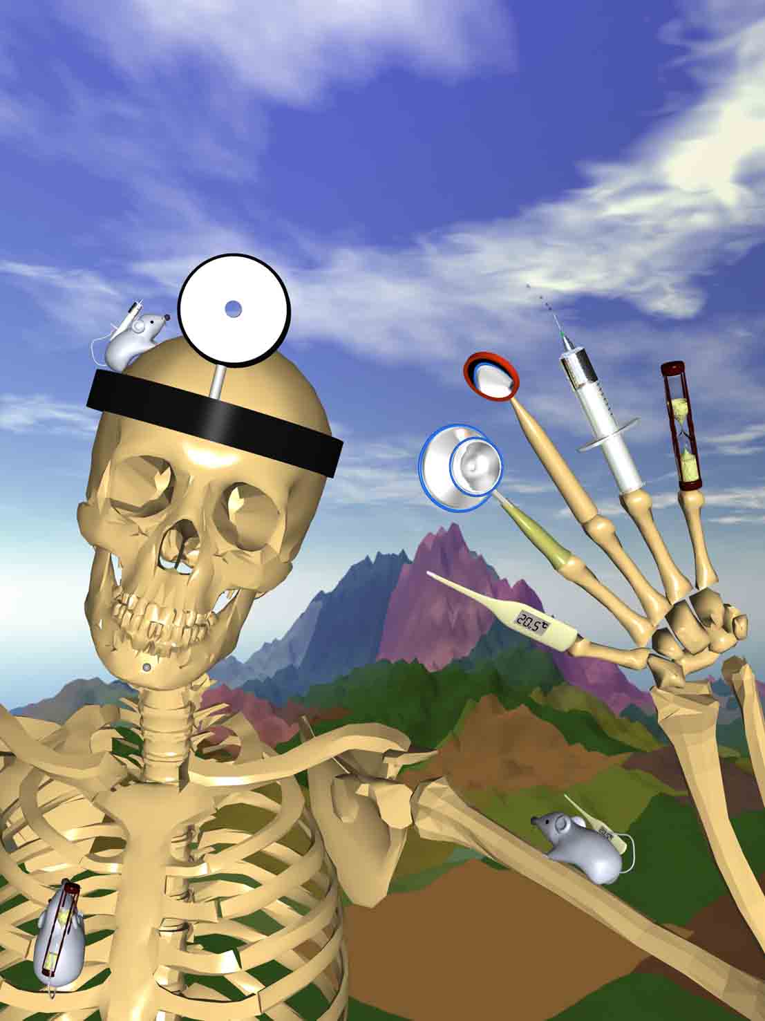 skeleton が(親指側から) 体温計、聴診器、歯鏡、注射器、砂時計を