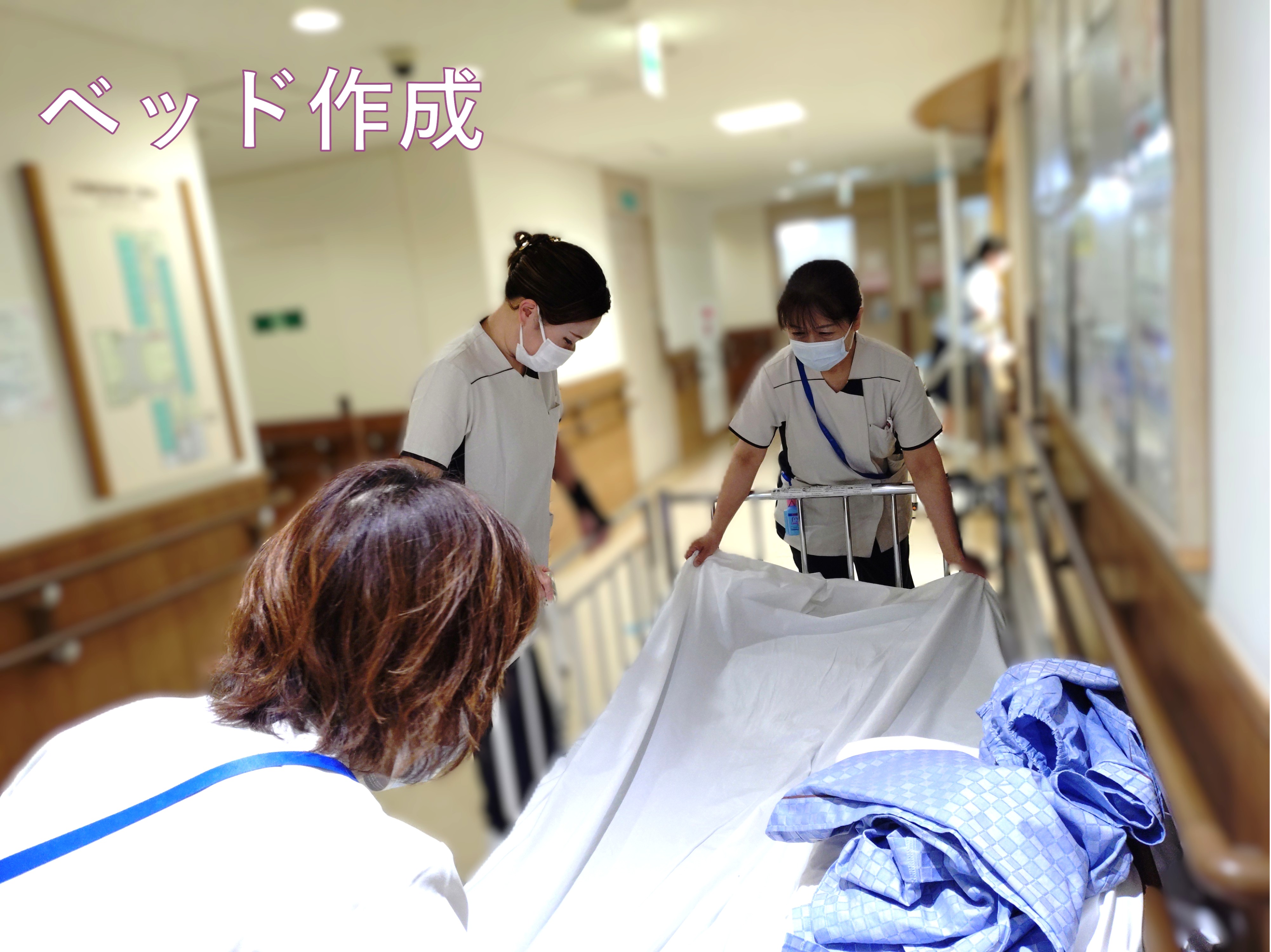 | 職務内容 | 病棟での看護補助 ・ベッド周辺の清掃と整理 ・ベッド作成 ・清拭や介助浴の準備と後片付け ・配膳下膳 ・シーツ交換 ・患者移送 ・物品の補充と後片付け ・車椅子や点滴スタンドなどの清掃と整備 ・伝票補充、等 |
