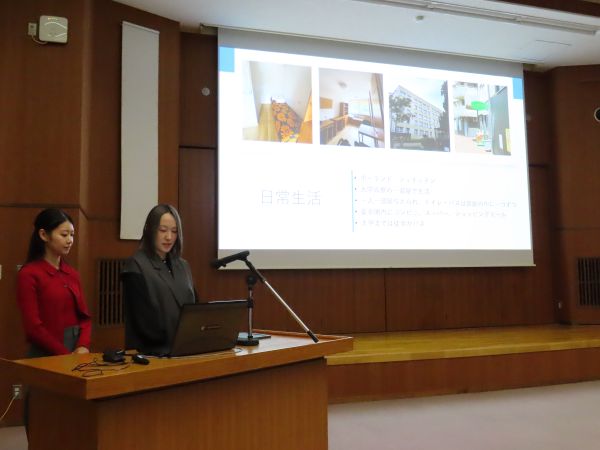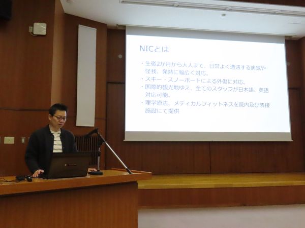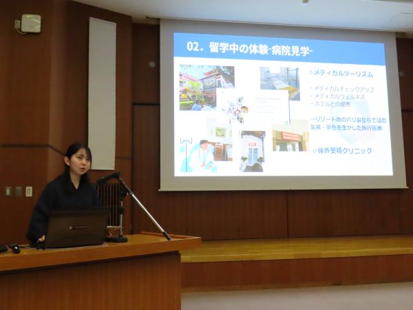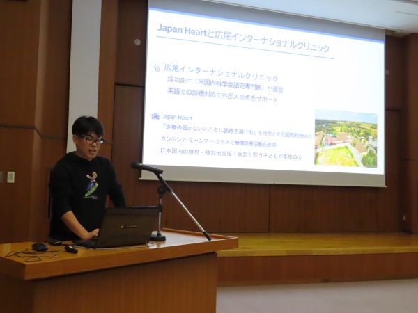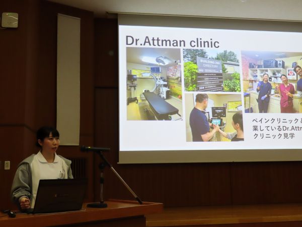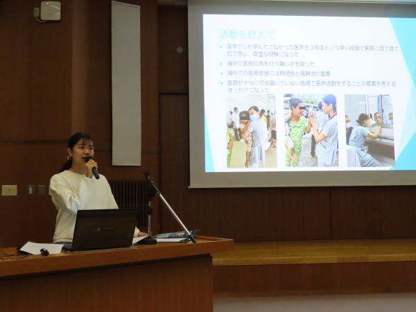 当日は、西川学長によるご挨拶に続き、民谷助教より本実習の特色についてご説明いただきました。その後、医学科学生3名が実習の成果を報告。患者の生活背景への理解、多職種連携の重要性、終末期医療など、実習を通じて得た学びや気づきが語られました。また、今後の抱負も述べられ、学生の成長が感じられる内容となりました。