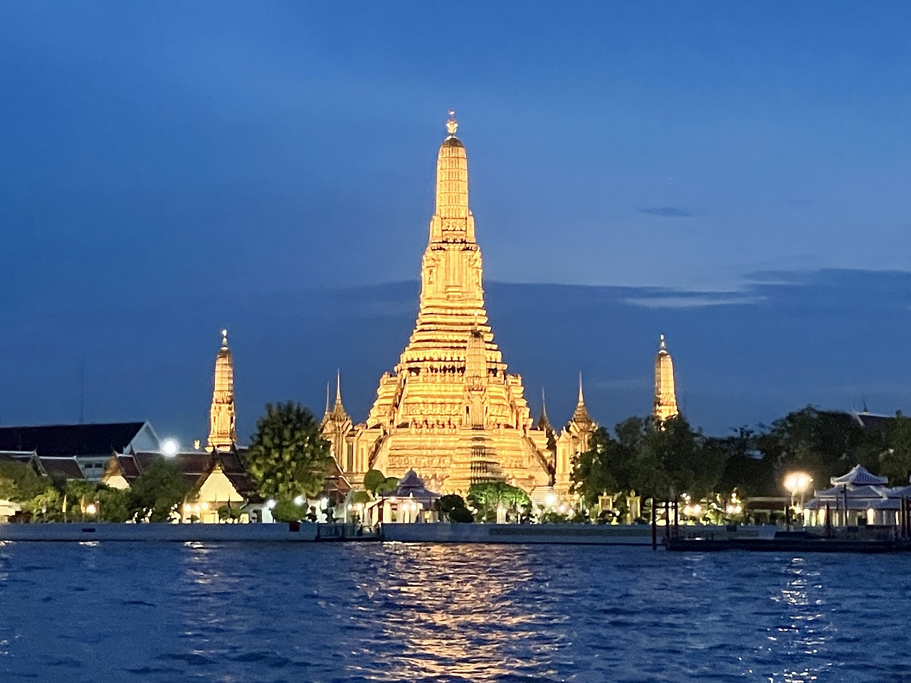 バンコクのトランジットで時間があったので、地下鉄でワット・ポーに向かいました。王宮の南側にある有名な涅槃仏を拝観し、タイ古式マッサージを体験しました。その後、雄大なチャオプラヤー川を渡し船で渡り、ライトアップされたワット・アルンを観賞しました。