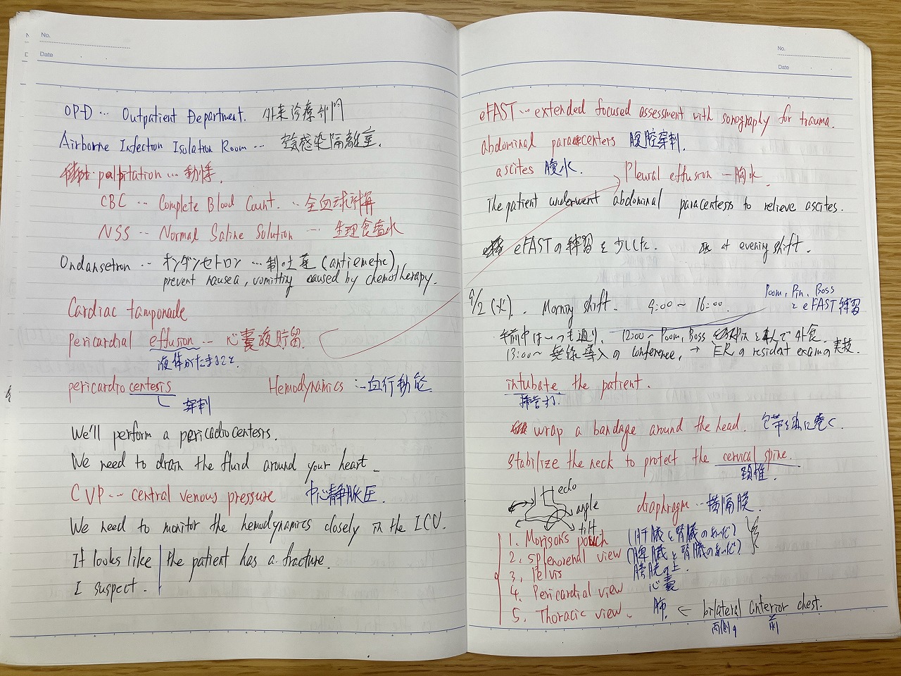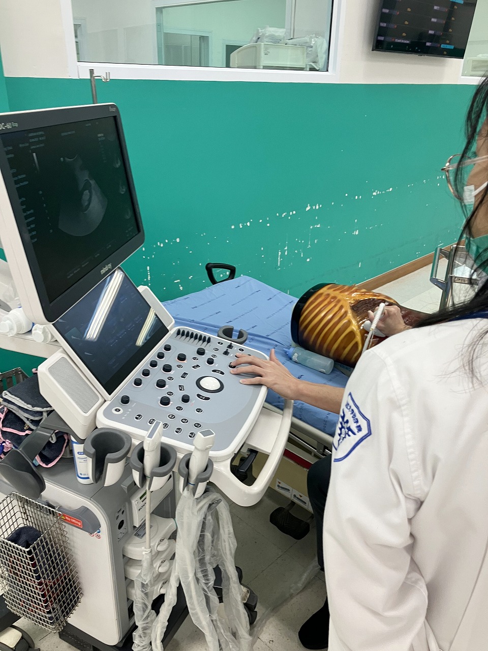 また、大学病院では経験できない貴重な手技を体験させていただきました。具体的には、ジフテリア・破傷風のワクチン注射、ジクロフェナクの臀部注射、腹水患者に対する腹腔穿刺などです。さらに、英語で行われる症例検討会や、救急レジデントの実技試験模擬演習にも参加することができました 。