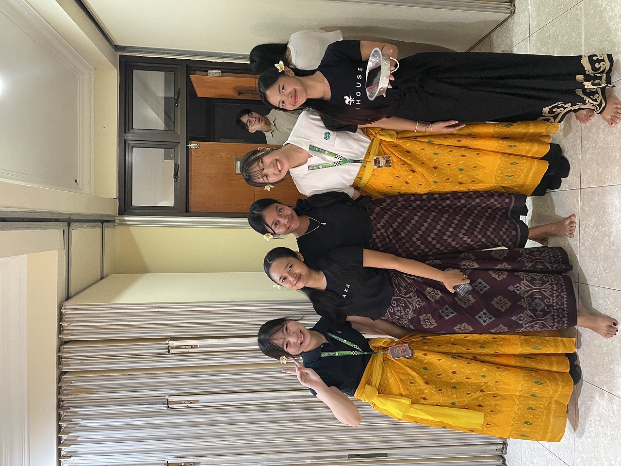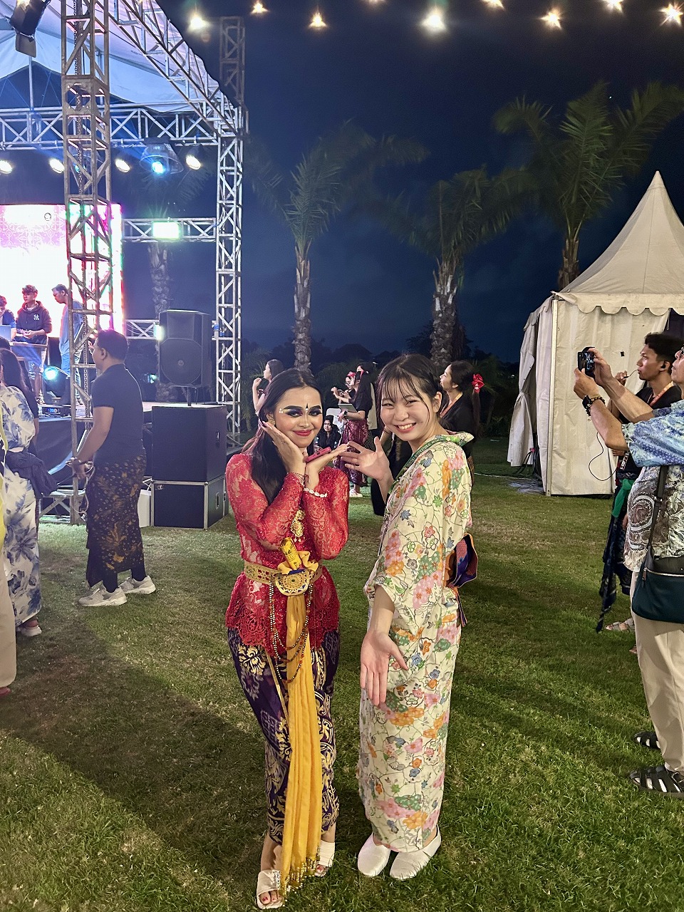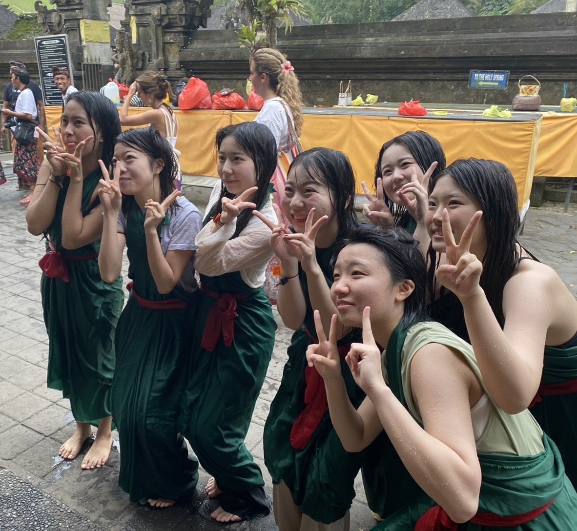文化体験では、バリ舞踊や沐浴体験など日本にはない文化を沢山体験することができ、とても充実した時間を過ごせました。沐浴では沢山の海外観光客が体験しており、列で待っている間他の観光客とも仲良くなりました。カルチュラルナイトでは、互いの文化を紹介しあう機会が設けられ、JPOP曲を歌ったりヨサコイを楽しんだりしました。バリの伝統衣装は数多くあり、どれも美しかったので、写真をたくさん撮って思い出に残しました。