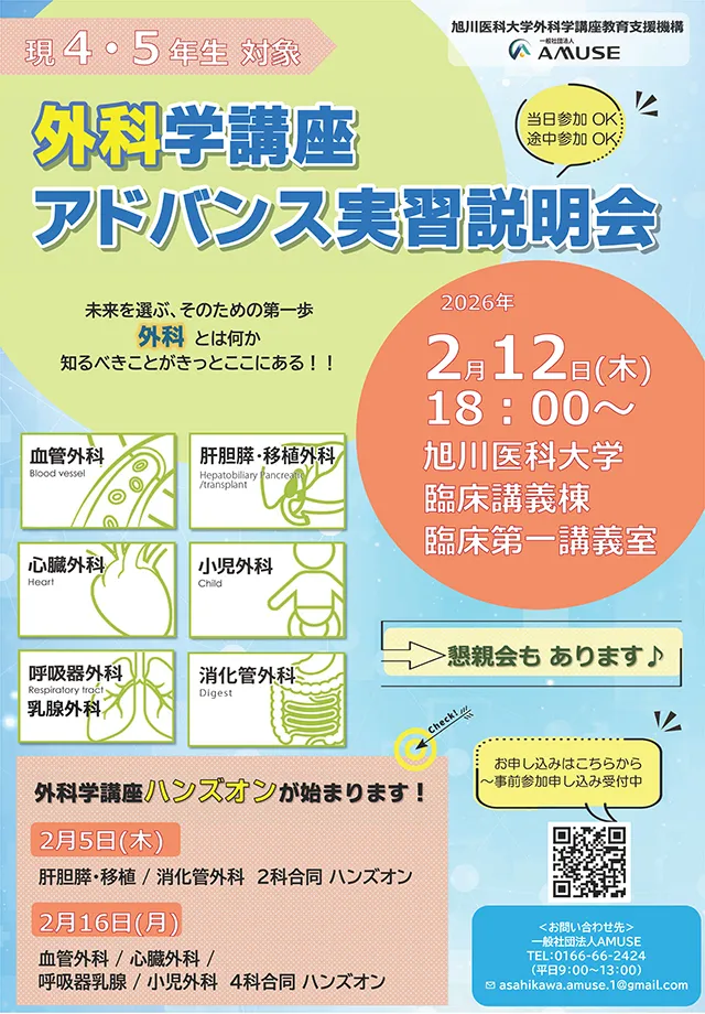 | お問い合わせ先 | 一般社団法人 AMUSE(旭川医科大学外科学講座教育支援機構) TEL:0166-66-2424 |