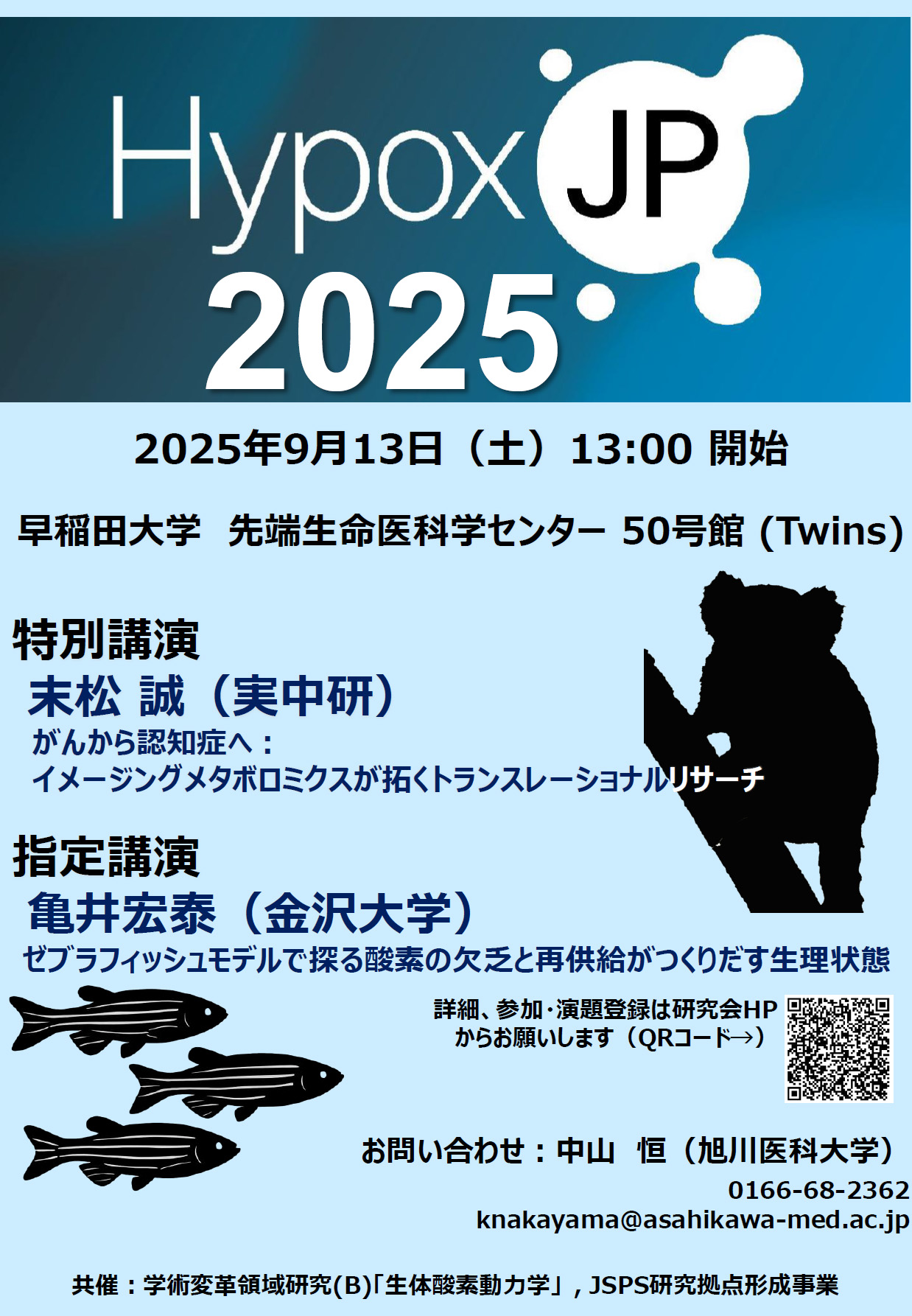 HypoxJP2025(ハイポキシア研究会学術集会)in 東京 HypoxJP2025学術集会が東京・早稲田大学で開催されました(当番幹事:中山 恒)。 たくさんの皆様のご参加、活発なご議論、ありがとうございました。 次年度もぜひHypoxJP学術集会にご参加下さい。