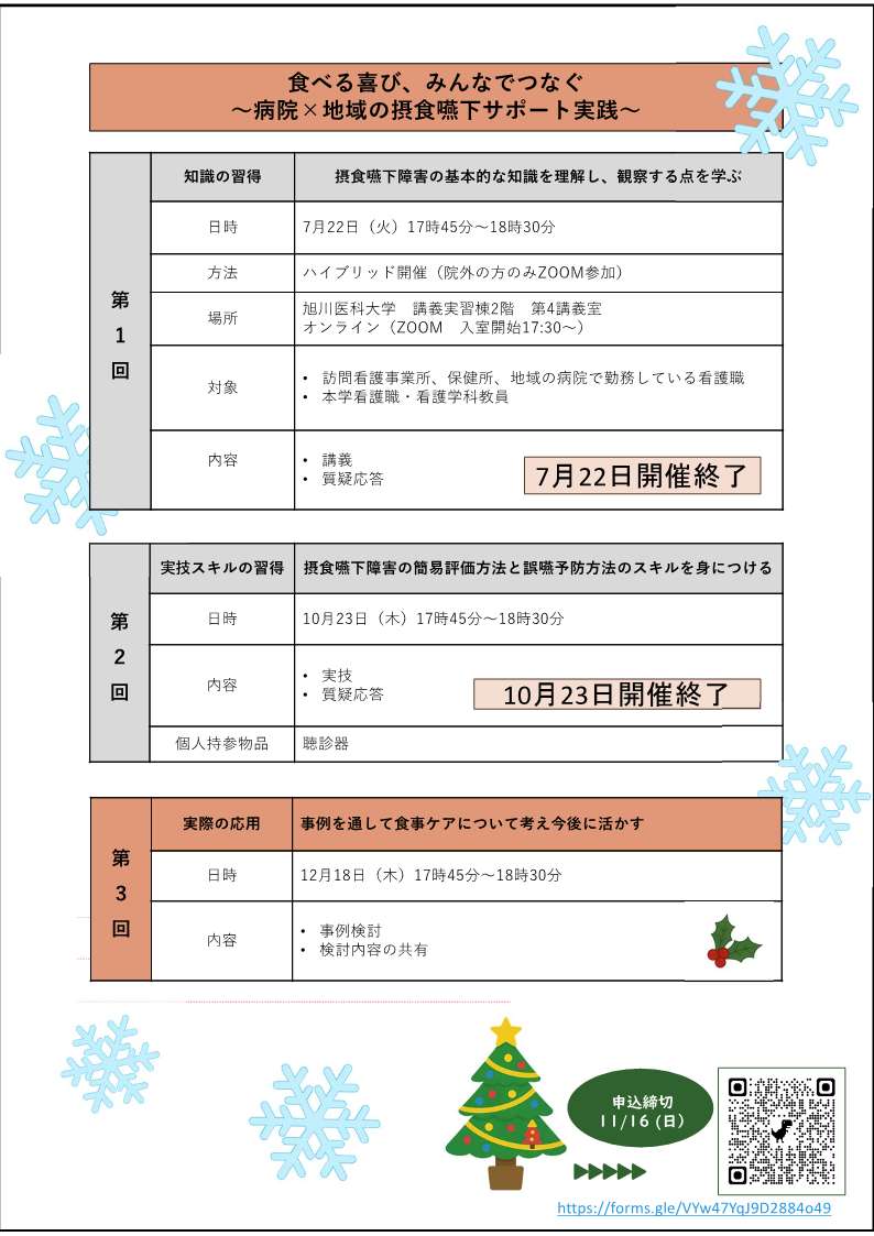 セミナーにより対象の食べる喜びを地域・病院の看護職がつないでいけるよう、皆様のご参加を心よりお待ち申し上げます。