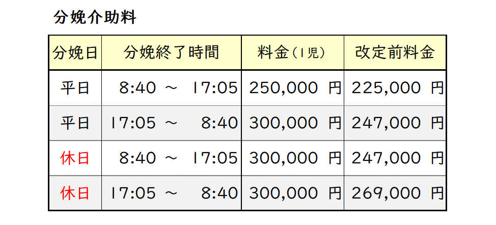 分娩介助料改定のお知らせ
