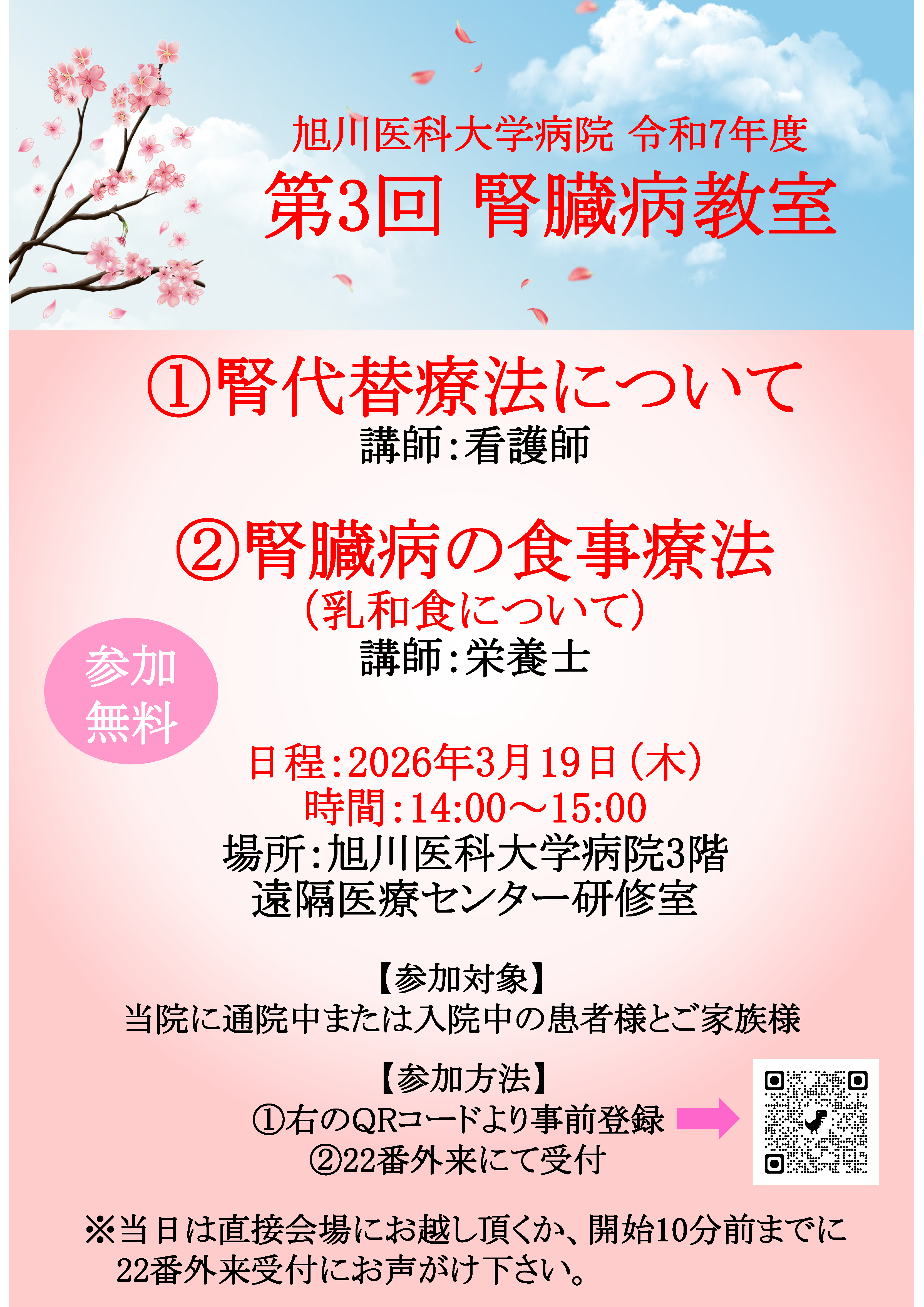 〇参加方法:下記「腎臓病教室申込URL」からお申込みいただくか、22番外来受付にお声がけください