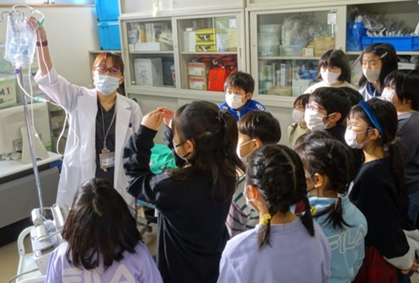 麻酔を使って手術をする時はどうなるのか、実際に人形を触りながら聴診器をあてたり、気管挿管の擬似体験をするなど、こども達の表情は真剣そのもの。貴重な体験をさせていただきました。