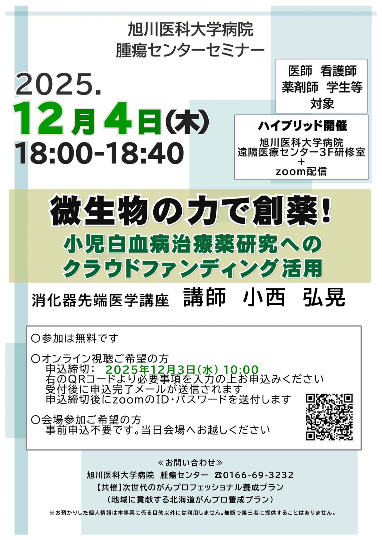 ホーム » セミナー(医療従事者) » 12/4「微生物の力で創薬!小児白血病治療薬研究へのクラウドファンディング活用」(腫瘍センターセミナー)