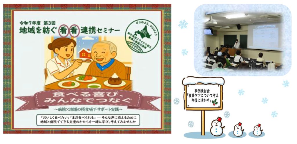 今年度は、「食べる喜び、みんなでつなぐ ~病院×地域の摂食嚥下サポート実践~」をテーマに、全3回シリーズの実践的な企画として実施しました。第1回・第2回では、旭川医科大学医学部看護学科看護学講座在宅看護学領域 教授 山根由起子先生を講師にお迎えし、「知識編」「実践編」として、摂食嚥下に関する基礎知識から具体的な支援方法まで、講義および演習を通して有意義な学びを提供していただきました。第3回では、これまでに学んだ知識と実践を踏まえ、嚥下機能障害のある方が「食べる喜び」を得るためにはどのような支援が可能かについて、事例を用いながら参加者同士で意見交換を行い、知恵を出し合いました。