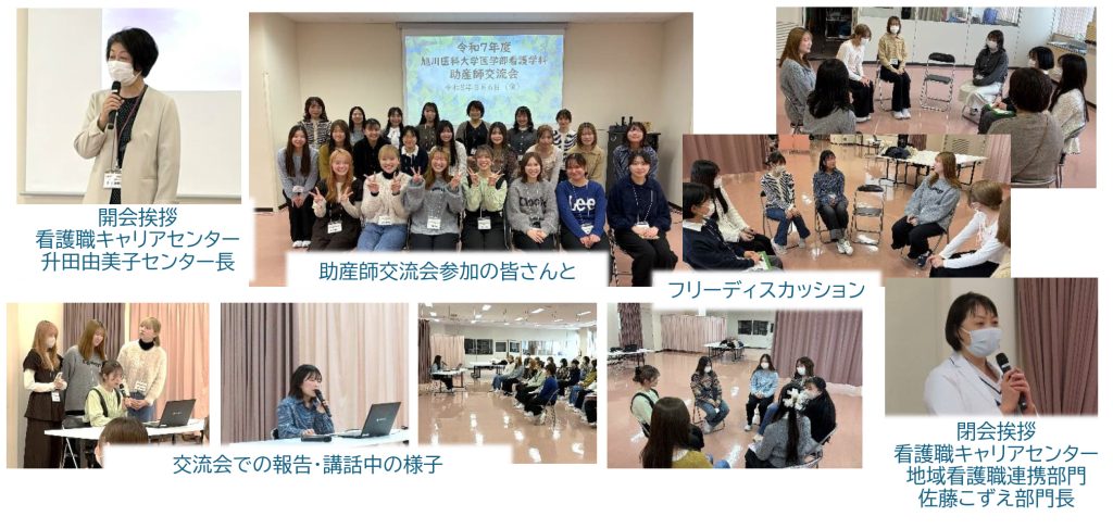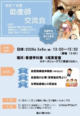 助産師交流会は、助産師を目指す1~4年の在学生と本学を卒業した助産師が直接交流することで、自己のキャリアポートフォリオを描くための一助とすることを目的に開催しました。