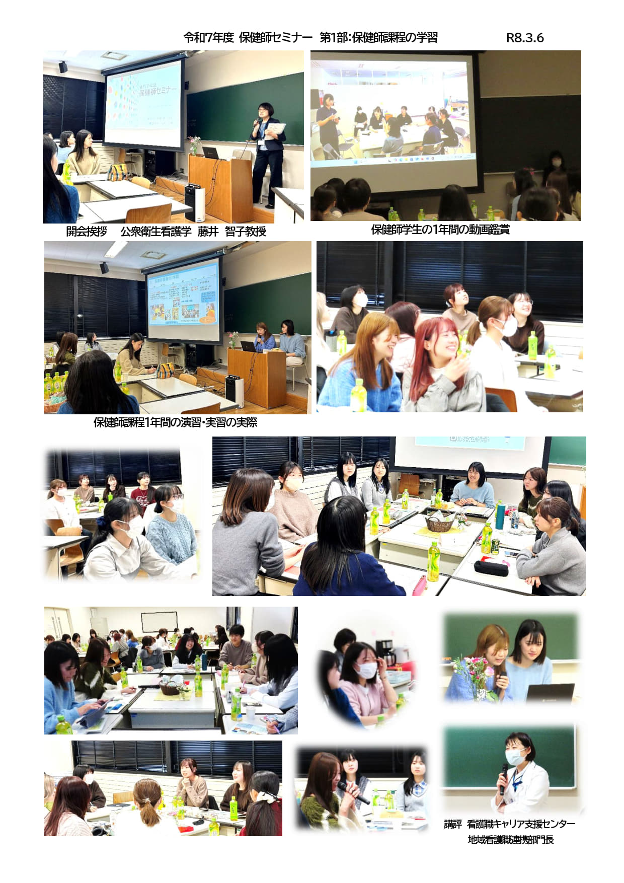 本セミナーの目的は、保健師課程の実際や保健師の活動内容を知り、先輩後輩の交流を通して将来のキャリアを考えることです。本学公衆衛生看護学領域の主催で、看護学科同窓会・看護職キャリア支援センターとの共催で開催しています。