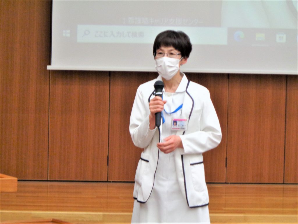 教育人事交流は運用システムを構築し、2021年10月からスタートしました。看護学科からは高齢者看護学領域所属の野中雅人先生が5階西ナースステーションへ、看護部看護職からはICU所属の滝本梨奈さんが成人看護学領域に赴き、各々の交流計画に基づき学びを深めました。教育人事交流報告会は、新型コロナ感染防止対策のためZoomを併用したハイブリッド形式で行い、関係者10名を除き、32名(Zoom19名、会場13名)の出席がありました。